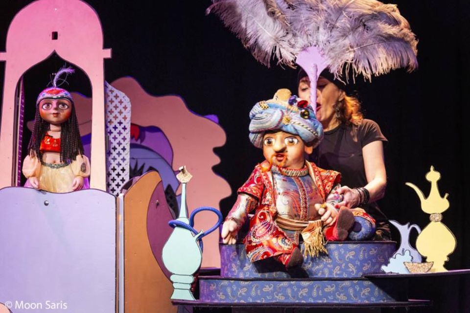 Een spannend en wondermooi sprookje uit duizend-en-een-nacht vol magie en humor, in een modern jasje. In een kleurrijk decor met animatie voert het prachtige poppenspel je mee naar een wereld van Oosterse steden, woestijnen en paleizen.